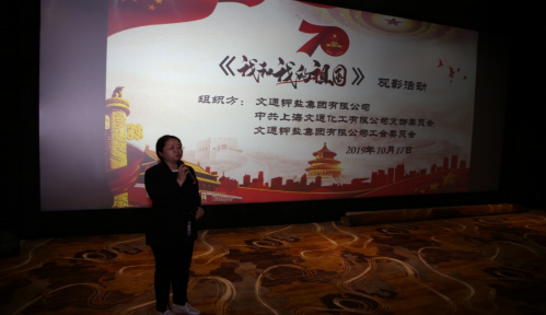 日期:2019/10/25 2019年10月17日下午17:45分由文通鉀鹽集團(tuán)有限公司、中共上海文通化工有限公司支部委員會(huì)以及文通鉀鹽集團(tuán)有限公司工會(huì)委員會(huì)共同籌辦,在中影UL國(guó)際影城組織公司黨員及員工一同觀看影片《我和我的祖國(guó)》。同時(shí)也借此機(jī)會(huì)共同慶祝中華人民共和國(guó)成立70周年,將愛國(guó)正能量傳遞至每個(gè)人。